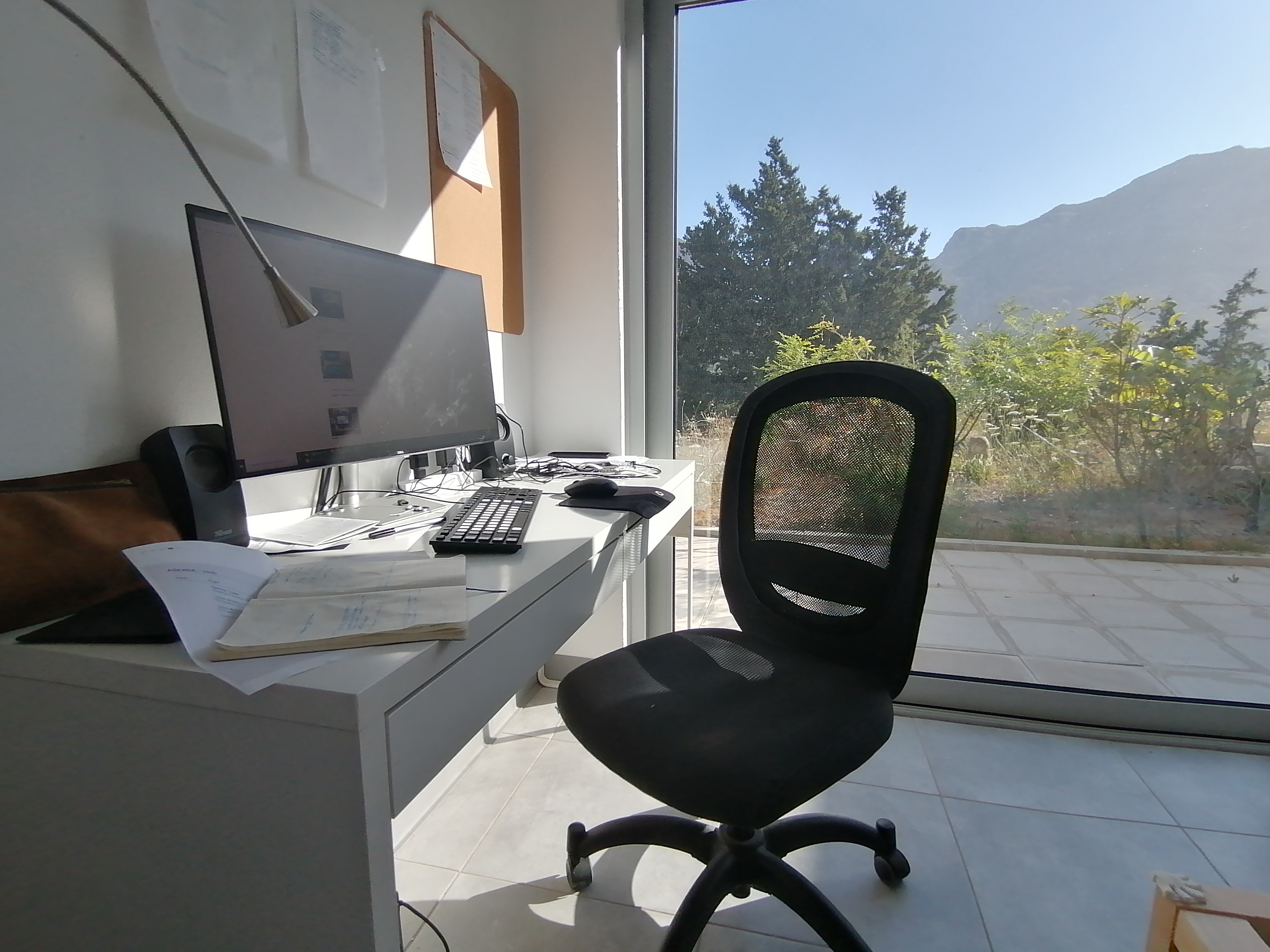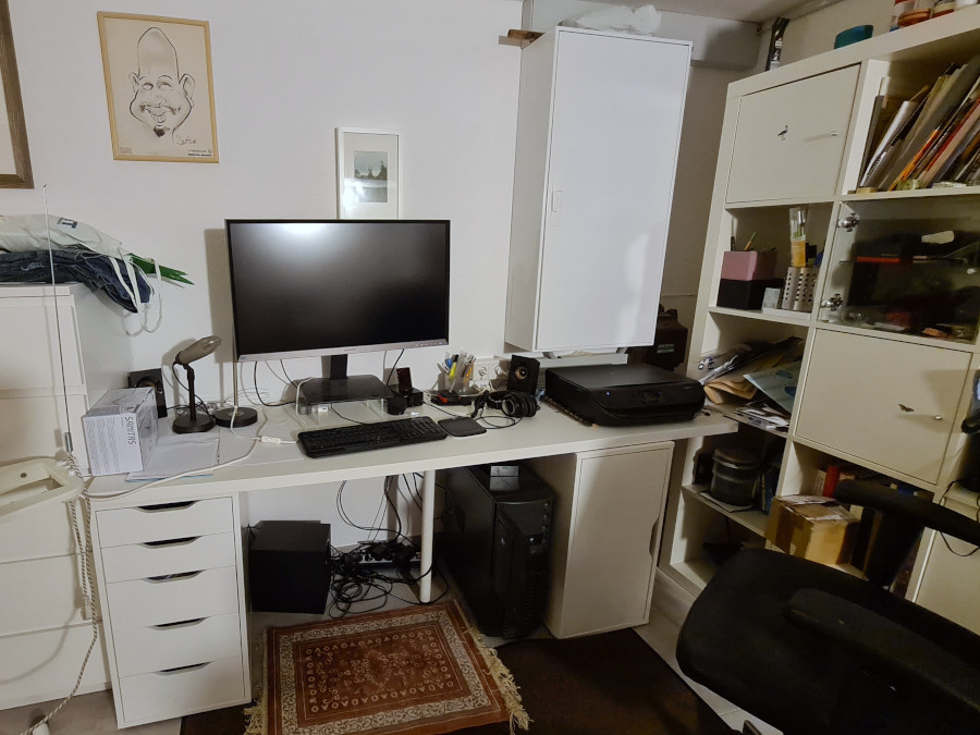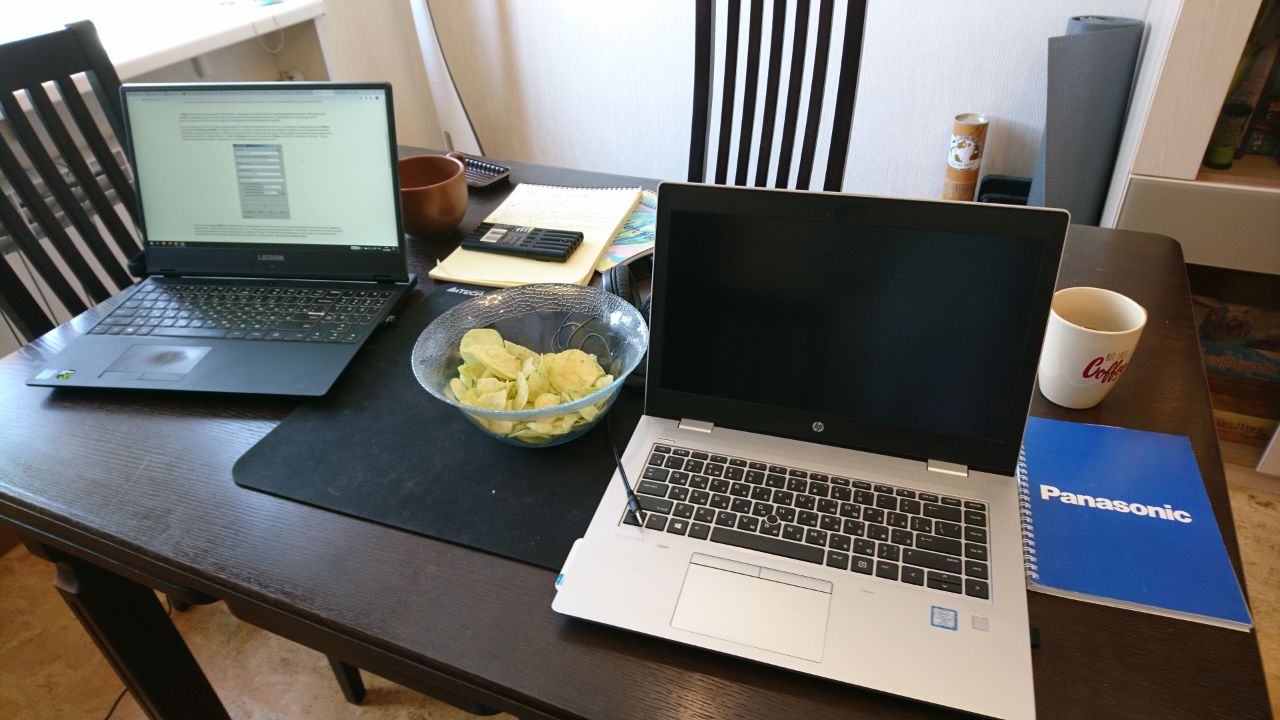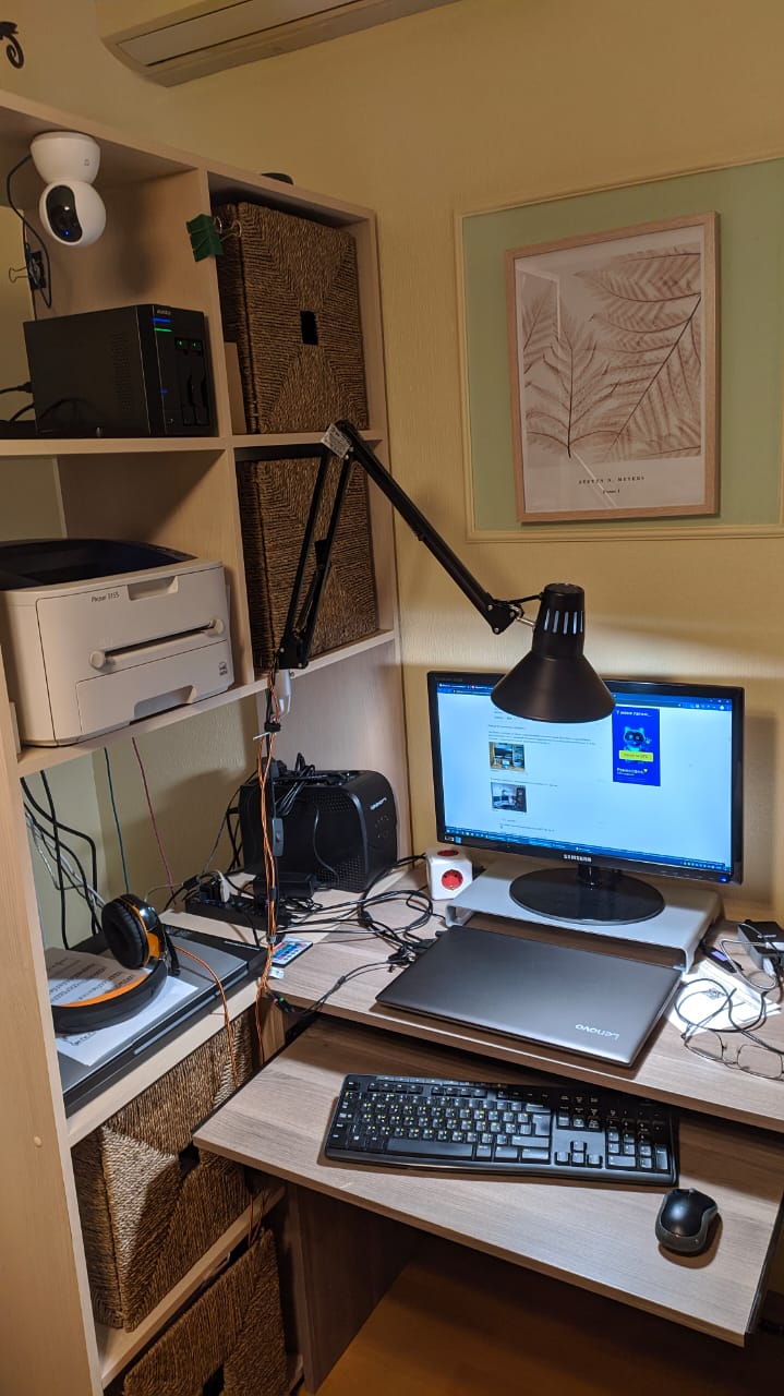 на самом деле есть еще большой рабочий кабинет (см. фото) с огромным монитором и всем делами, но т.к. кабинет в подвале, а надо следить за ребенком, который в основном на первом этаже, то сижу на кухне
