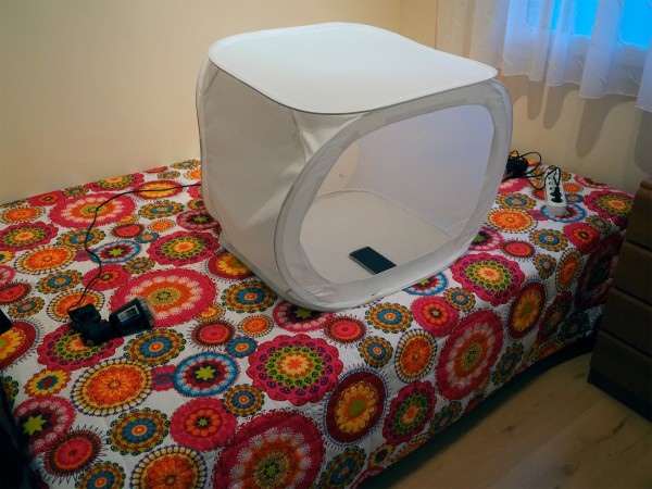 Да там все просто. Один небольшой лайтбокс вот такого типа и две лампы-вспышки без штативов, лежащие слева-справа от лайтбокса на расстоянии примерно полуметра. Раньше еще использовал третью лампу-вспышку на штативе, которая ставилась сверху, но понял, что в ней нет необходимости.