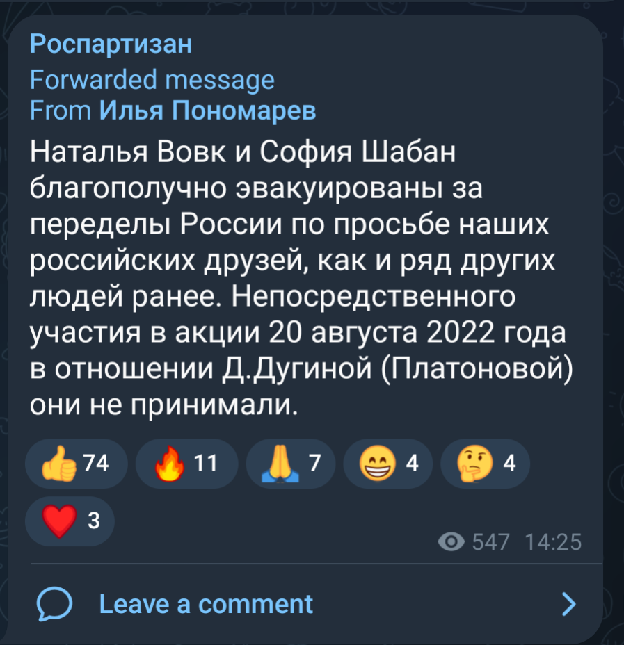По информации ведомства, внедорожник Дугиной заминировала 43-летняя Наталья Вовк. В Россию она приехала 23 июля вместе с дочкой Софией Шабан — арендовали квартиру в том же доме, что и Дугина, и следили за ней на Mini Cooper — трижды меняли номера. В день преступления Вовк с дочерью были на фестивале "Традиция", а сразу после подрыва уехали в Эстонию через Псков." (с) Mash