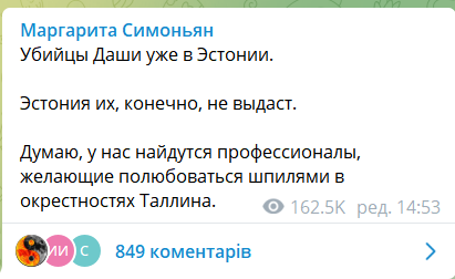 ""Есть в мире и справедливость. Дугин - идеолог русского фашизма, вдохновивший путина на захват Украины - редкостная мразь. На его совести тысячи погибших. По роковой случайности взорвали дочь, а не его. Наверное, это "карма". Теперь и он сможет понять, что это значит ‒ похоронить ребенка. Дочь, к слову, была такой же как и отец - фашисткой. ...Скоро - по всей России прогремят взрывы возмездия. Нас ожидает богатая на трупы русских фашистов осень".