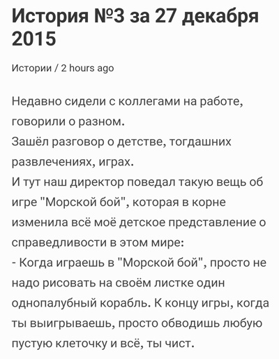 Развлекался так - выстривал все корабли по внешним клеткам, а один не рисовал. Занятное выражение было на лице "соперника", когда он нащупывал "победную тактику", а после метался по полю в поисках "подводной лодки", как я этот корабль называл. Этот переход от "вот ты лох, хаха" к "как же так, б.." - бесценен. 😄