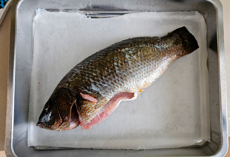 Поставил в духовку на 200 на полчаса - точно так же я готовлю корвину (сибас, дораду) такого же размера.