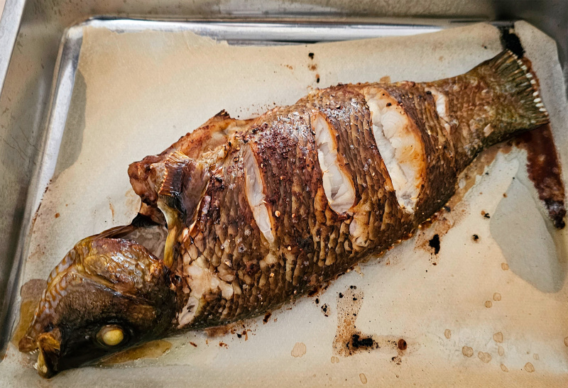 Зеркальный карп, начинка из укропа и сметаны, 30 минут в духовке.