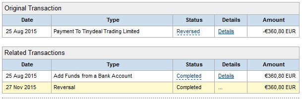 У меня была похожая история с TinyDeal (я тут как-то упоминал о ней), только у меня были автомобильные держатели для телефонов общей ценой полтора десятка евро. Китайцы мало того, что прислали не ту модель, так еще и дефектные. Деньги возвращать отказыались, предлагали пойнты их магазина, так что в конце концов тоже открыл кейс в ПэйПоле и по итогам получил деньги обратно.