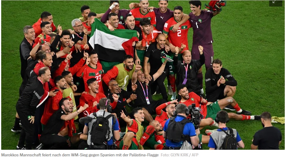После победы над Испанией команда Марроко вышла на поле с флагом Палестины: