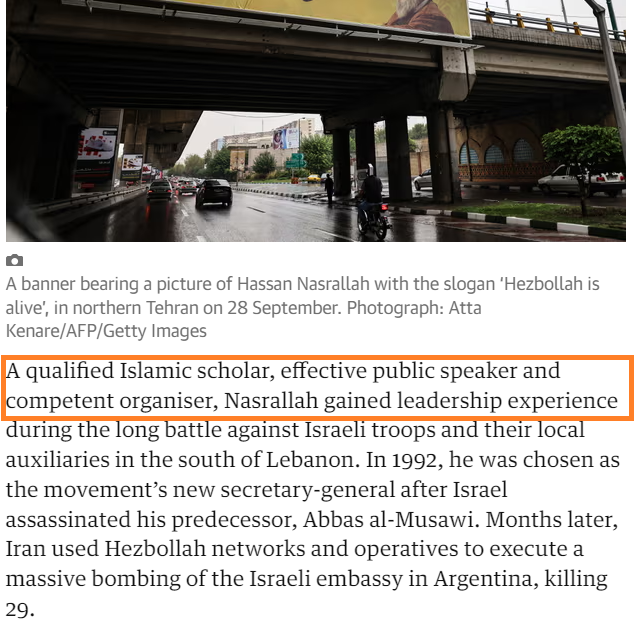 За 32 года своего руководства организацией и при поддержке Ирана он превратил "Хезболлу" во внутреннюю политическую силу и одну из самых хорошо вооруженных негосударственных сил в мире. Г-н Насралла выступал против Израиля, который он называл "сионистским образованием", и утверждал, что должна существовать единая Палестина с равенством мусульман, евреев и христиан (прим. Экслера - зацените пассаж). Сильный оратор, он был любим многими мусульманами-шиитами, исторически маргинализированной группой в арабском мире, и создал в Ливане государство внутри государства, которое предоставляло социальные услуги.