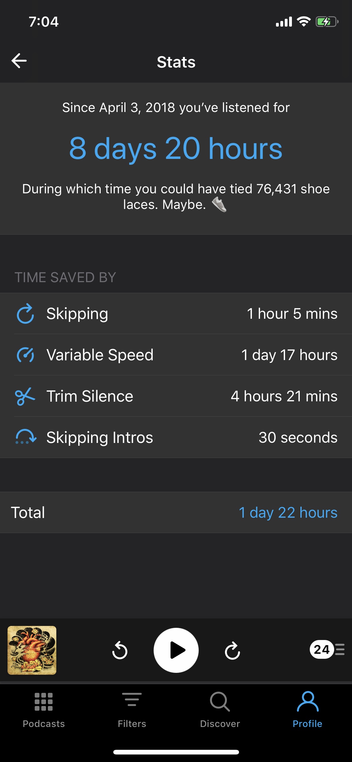 Еще одна фишка, немного оффтоп, но может кому-нибудь пригодится. Слушаю через PodcastRepublic примерно лет 5, у них почти сразу появилась опция изменения скорости подкаста, причем для каждого из них можно установить свою. Начал понемногу увеличивать и через полгода уже легко слушал в 1,5 раза быстрее, теперь слушаю в основном на 2,4. Звучит конечно очень дико если с кем-то рядом звук вдруг включится без наушников. Но в наушниках на этой скорости восприятие информации теперь совершенно обычное. Туда же полетели и сериалы на 1,5-1,8 и кино иногда.