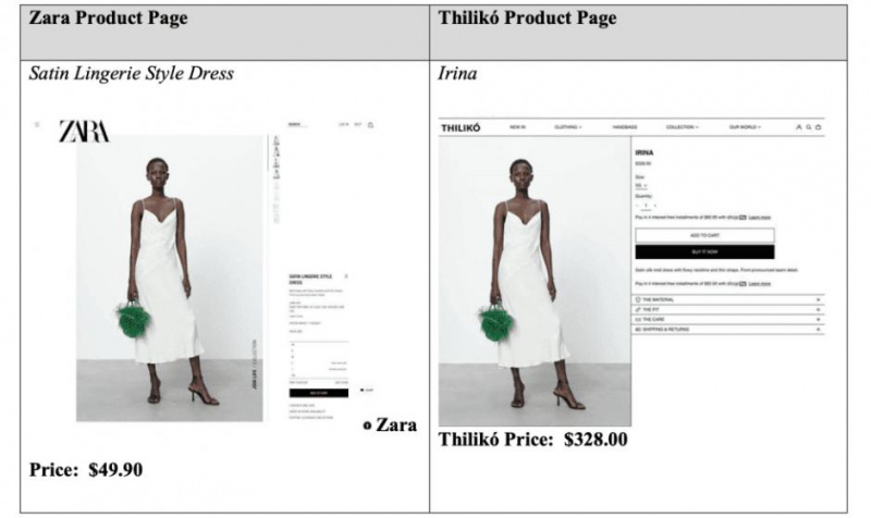 Известная по всему миру испанская компания Zara (владелец бренда - Inditex Group) обнаружила, что некий "социально ответственный модный бренд" из Лос-Анджелеса под названием Thilikó нагло прёт одежду производства Zara, наклеивает на нее свою этикетку и продает уже типа как под своим брендом, при этом еще и повышая цену раз в семь. Также они не стеснялись рекламировать эти вещи с помощью фирменных фотографий Zara, также, разумеется, защищенных авторским правом.