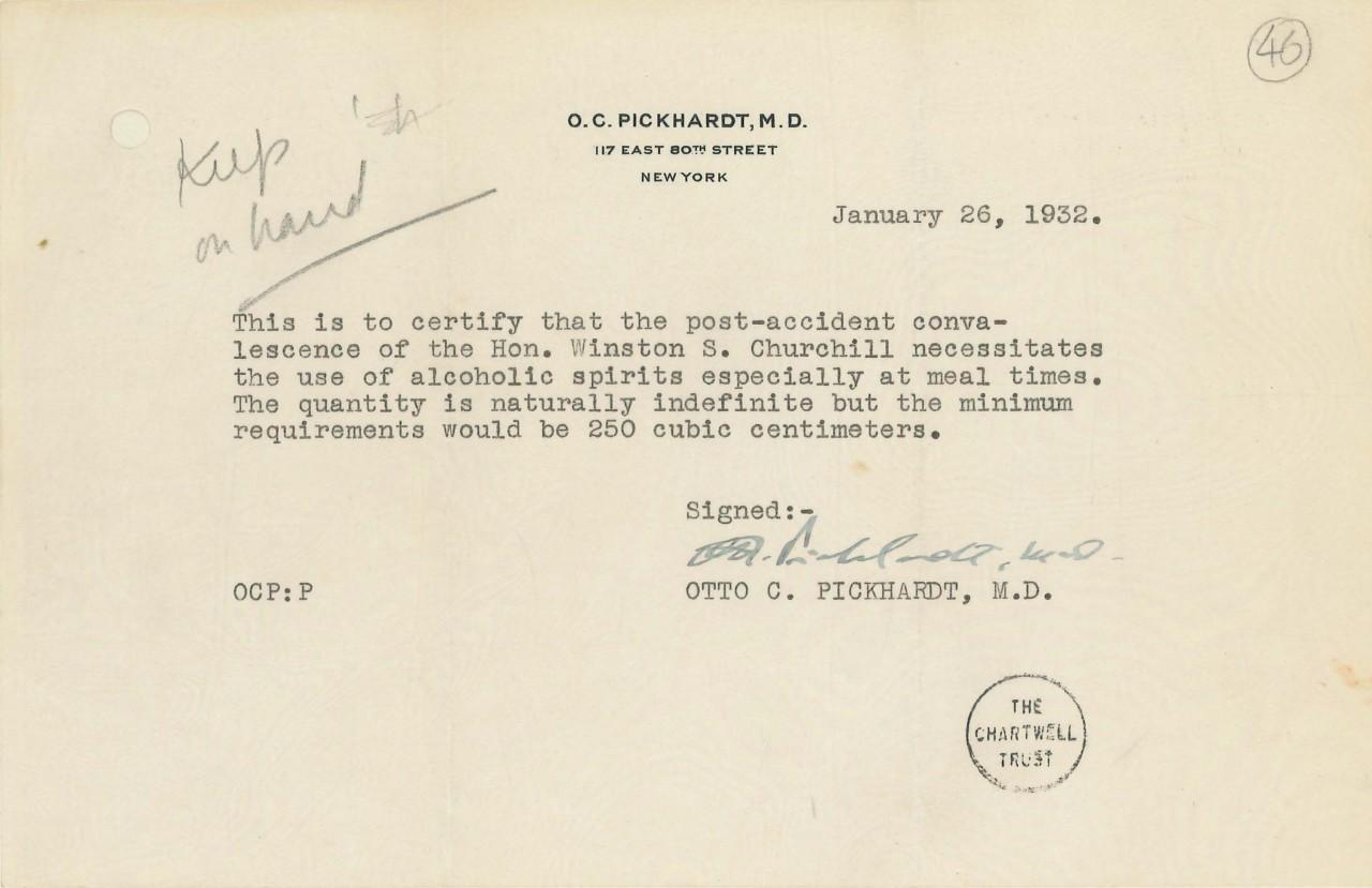Когда Черчилль в начале 30-х ездил в США с их сухим законом, ему выписали вот такой рецепт, чтобы он мог покупать алкоголь "в медицинских целях"...