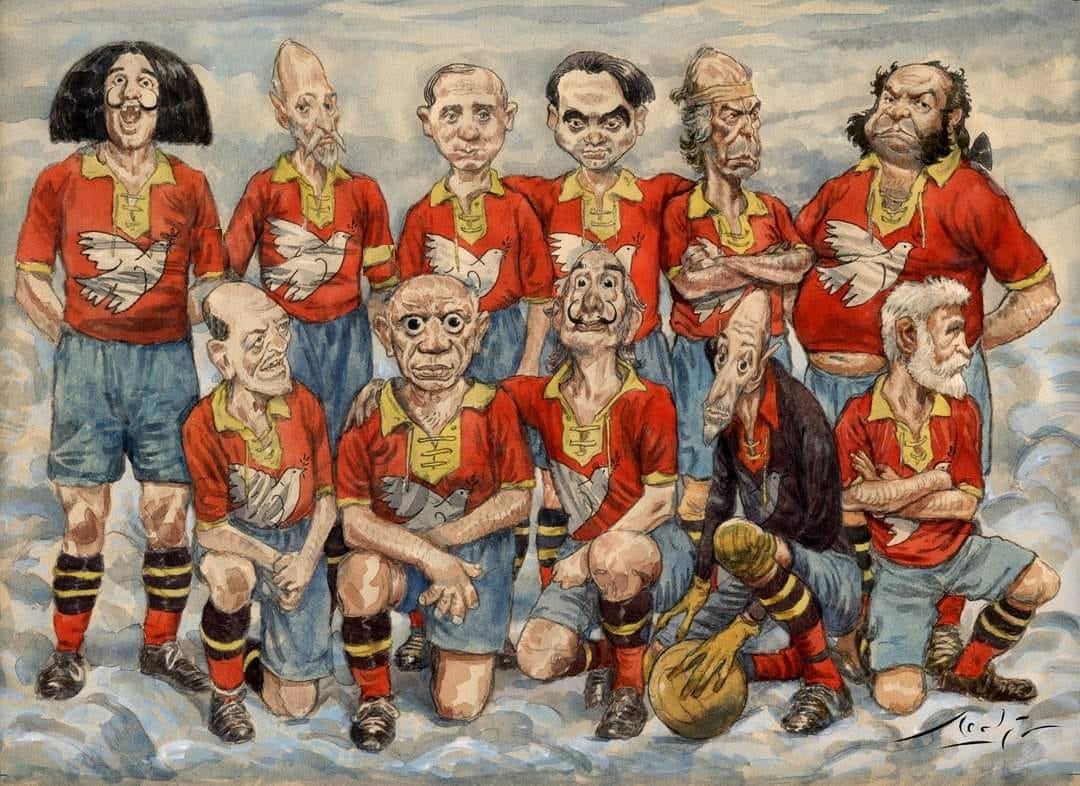 Стоят - Диего Веласкес , Мигель Сервантес, Жоан Миро, Гарсия Лорка, Пако де Люсия, Франсиско Гойя; сидят - Луис Буньюэль, Пабло Пикассо, Сальвадор Дали, Эль Греко, Антони Гауди. Дон Мигель де Сервантес Сааведра — эль капитан.
