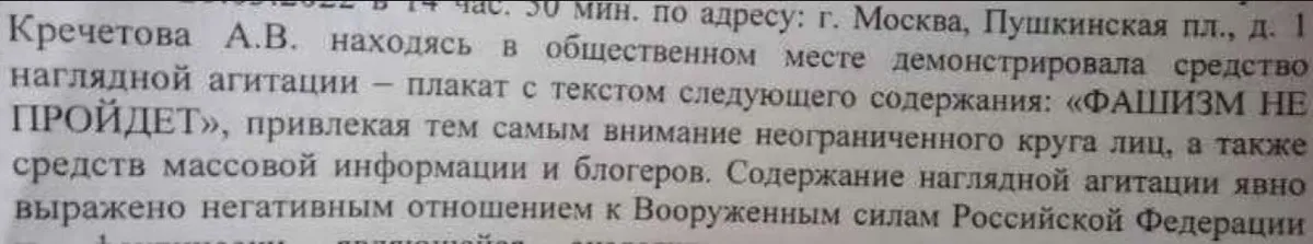 Суд оштрафовал гражданскую активистку Анну Кречетову на 50 тысяч рублей за одиночный пикет с соответствующим плакатом по административной статье о дискредитации российских военных (ч. 1 ст. 20.3.3 КоАП).