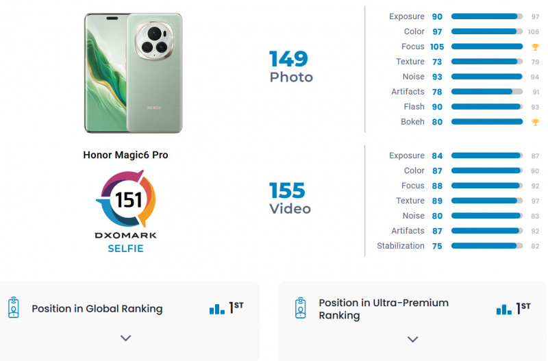 Что интересно, в рейтинге фронтальных камер Honor Magic6 Pro тоже занял первое место.