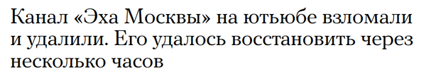 Э... Мне кто-нибудь может объяснить, как можно "взломать и удалить" youtube-канал с двухфакторной аутентификацией (даже я такую использую, а уж что на "Эхе" такую не используют - я поверить не могу) и как его при таком крутом взломе можно восстановить (очевидно, что если взломали, то все данные аутентификации поменяли) со всеми удаленными данными через несколько часов?