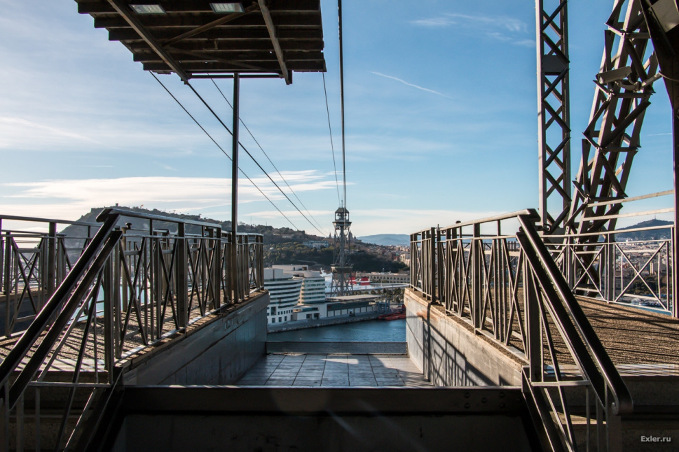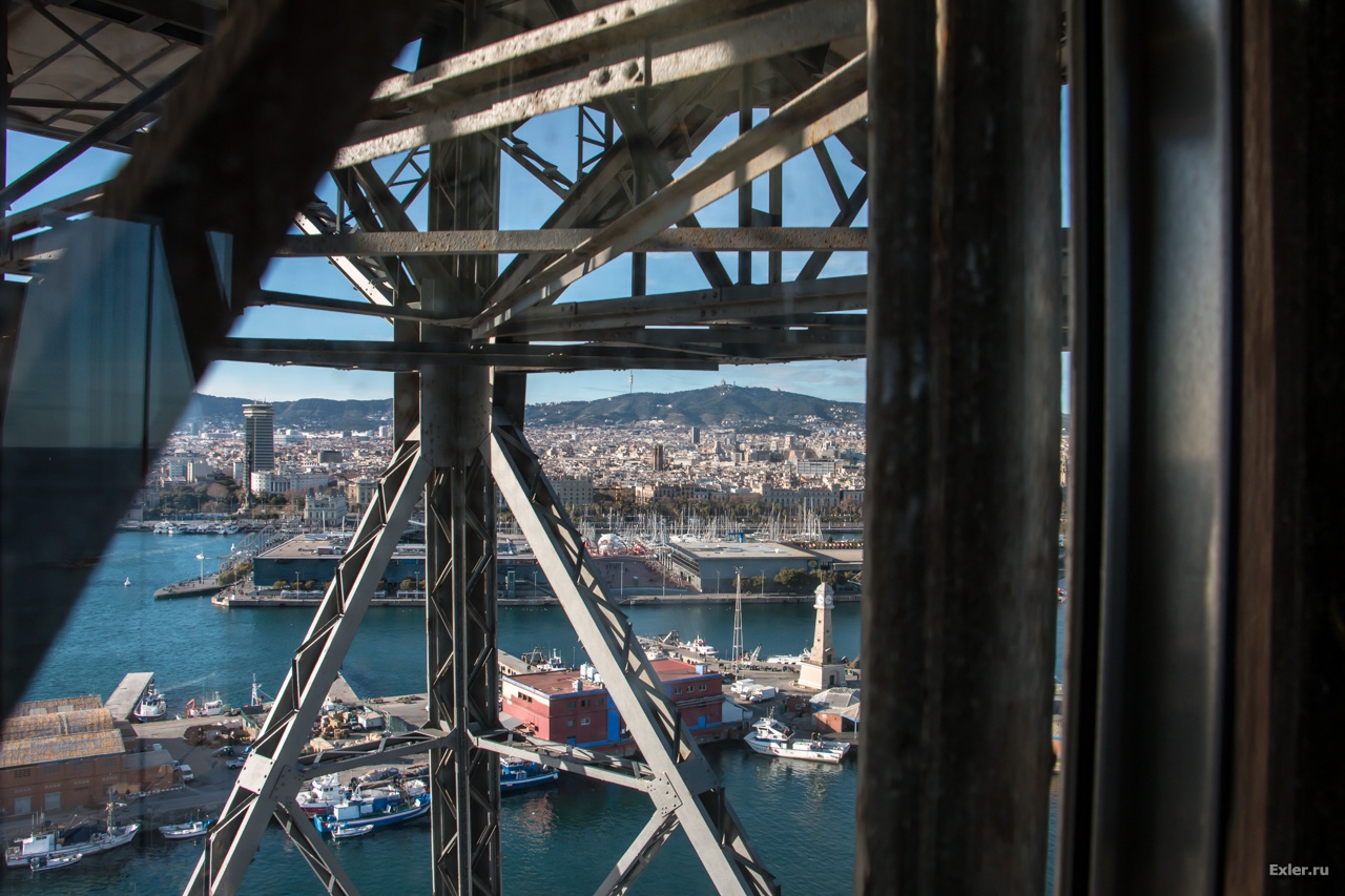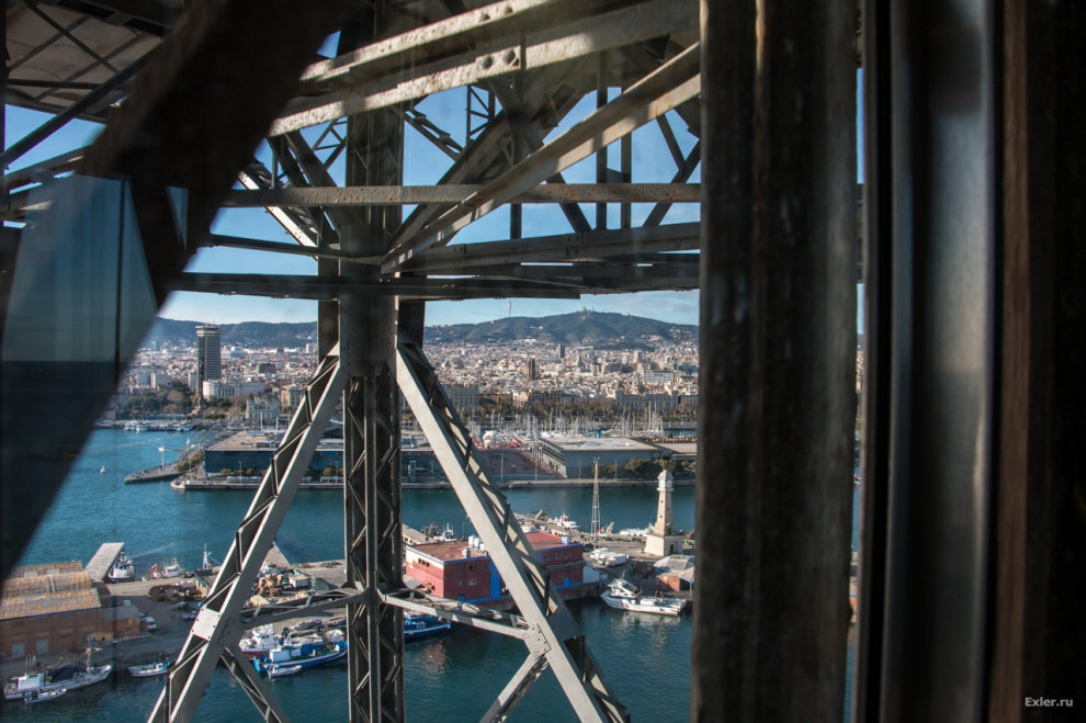 Не прошло и четырех лет, как я наконец-то добрался до барселонской канатной дороги, которая идет от порта до горы Монжуик. У канатки две башни, причем посадка осуществляется на самой дальней, которая находится вот здесь. (Фотографии кликабельны, часть снята через стекло - не обессудьте.)