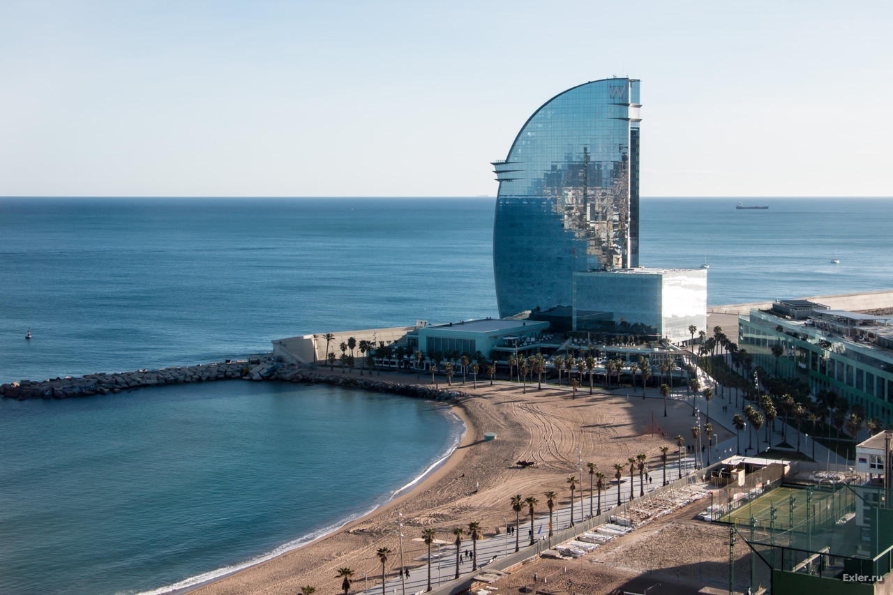 А это знаменитый отель W Barcelona. Самый простой дабл 200€, с видом 250€, большой номер с видом 500€, ну и дальше в потолок. Но виды там совершенно сумасшедшие, конечно.
