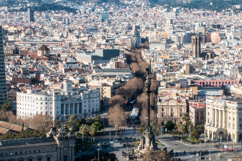 А это видна та самая Ла Рамбла (La Rambla) - улица, где очень легко лишиться сумки или бумажника. В начале улицы на площади - памятник Колумбу.