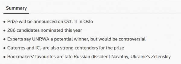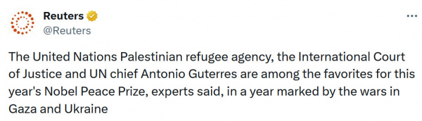 Эксперты считают, что потенциальный победитель - UNRWA (БАПОР). Напомню, что это ооновское агентство, которое является главным спонсором ХАМАС в секторе Газа, которое на свою благородную деятельность получает от государств членов ООН сумму, равную половине бюджета ООН - $1,6 миллиарда. Доказано, что некоторые сотрудники UNRWA причастны к теракту 7 октября.