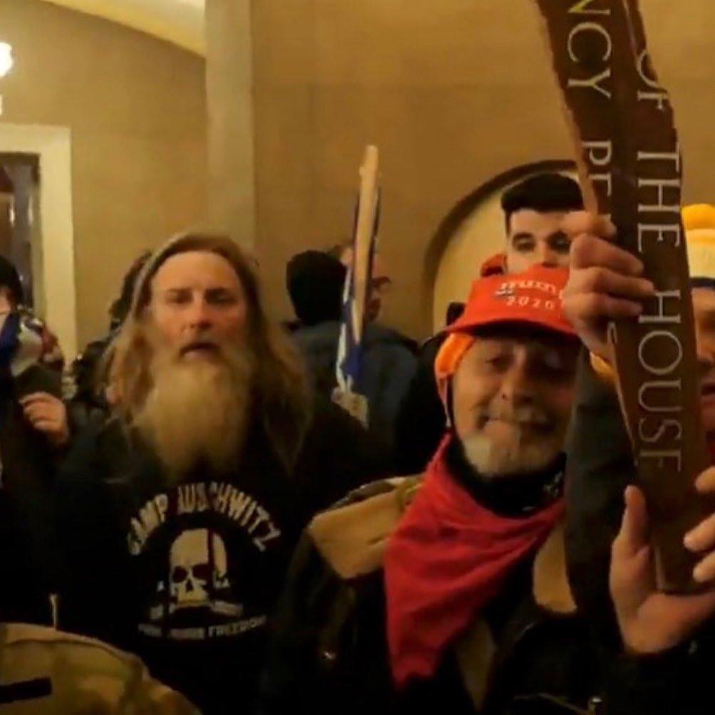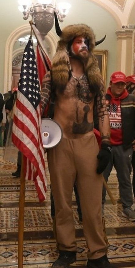 0:55 Чувак в костюме викинга -- Кью-анонист, который своими действиями боролся с педофилами-сатанистaми, и далее со всеми остановками.