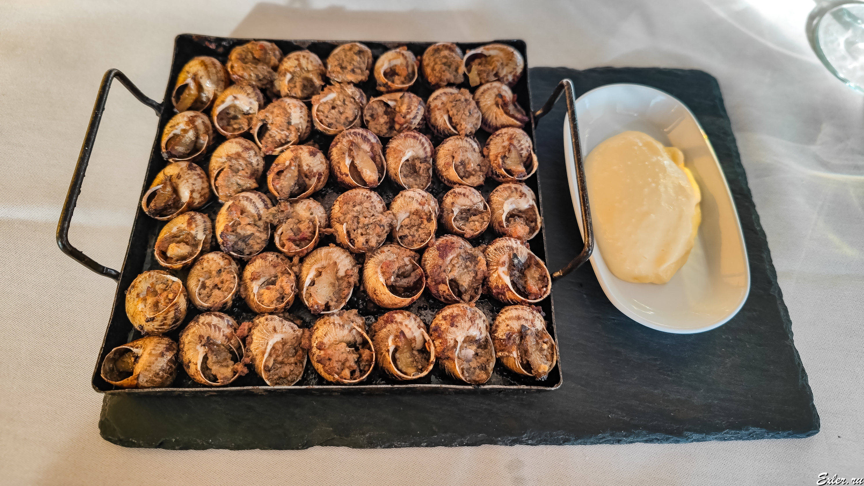 Upd:  Попросили пояснить, как эти улитки вообще есть. Технология следующая. Обычно к улиткам дают зубочистки или специальные длинные заостренные палочки. Зубчиком вилки придерживается раковина, заостренная палочка втыкается в улитку, после чего улитка вытаскивается легким движением, обмакивается в соус (при необходимости) и отправляется в рот. Каждые пять улиток обязательно запить глотком вина. Любого, которое нравится. Но к улиткам вообще хорошо идет и красное, и белое. И какое угодно.