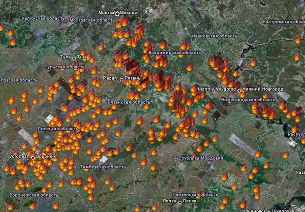 Выглядит это крайне печально. Оперативную карту пожаров можно скачать здесь. Если нет Google Earth - скачать здесь. (Спасибо Гарику за ссылки.)