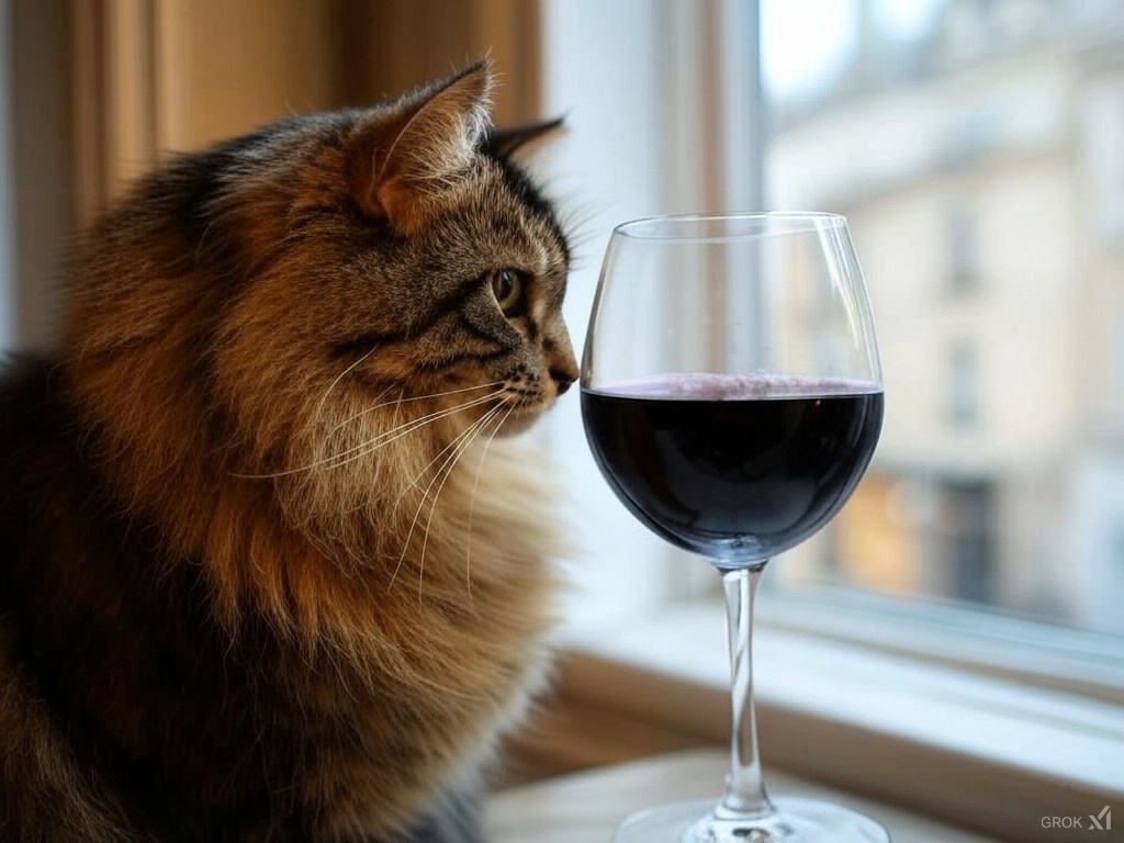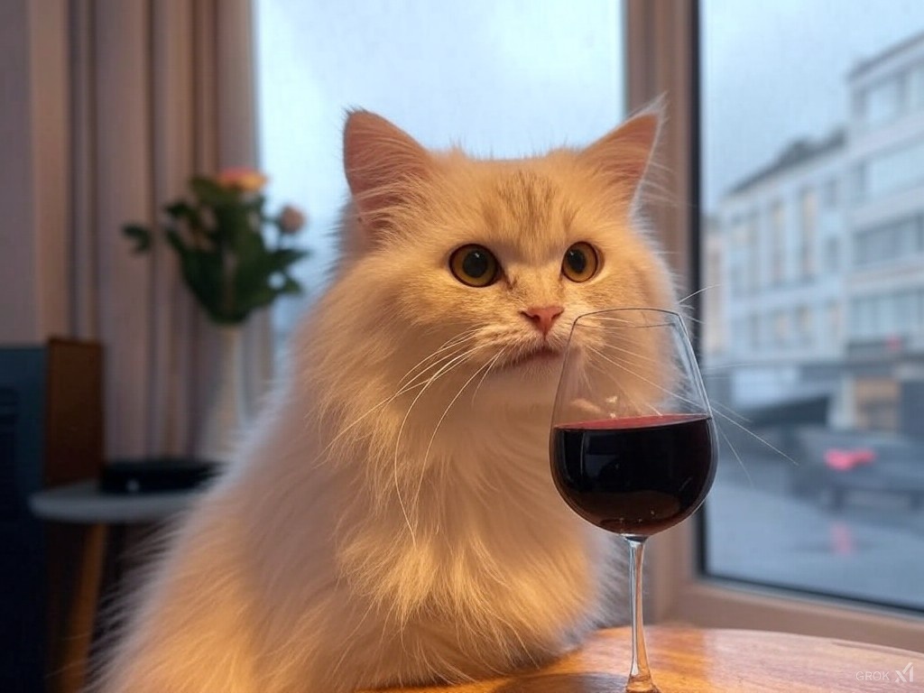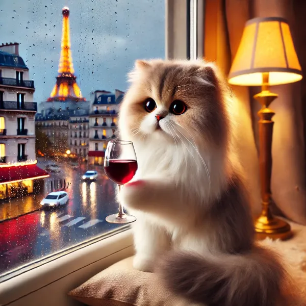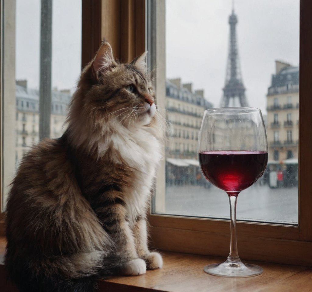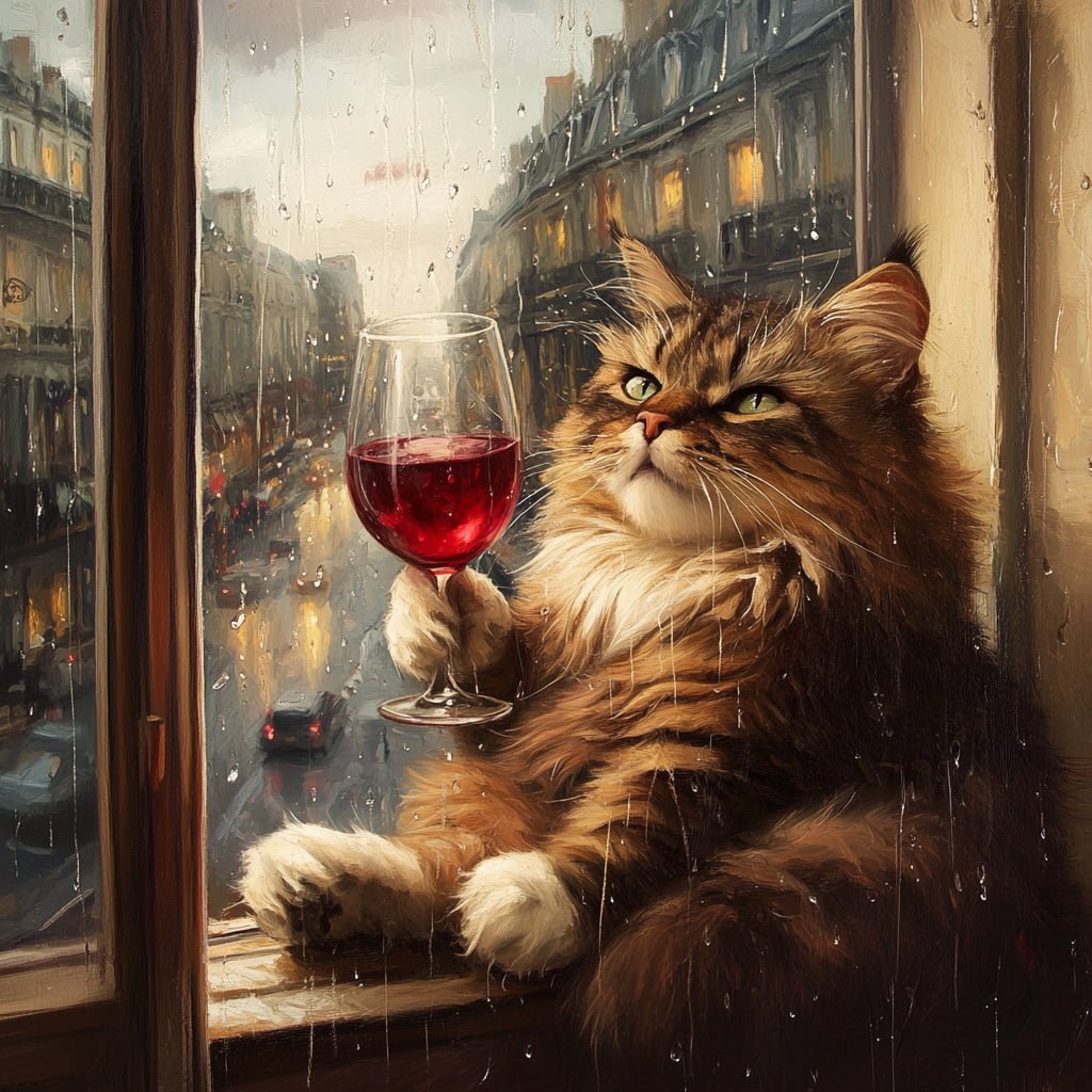 "Generate a realistic image of a fluffy and playful cat sipping red wine by a window on a rainy day in Paris".