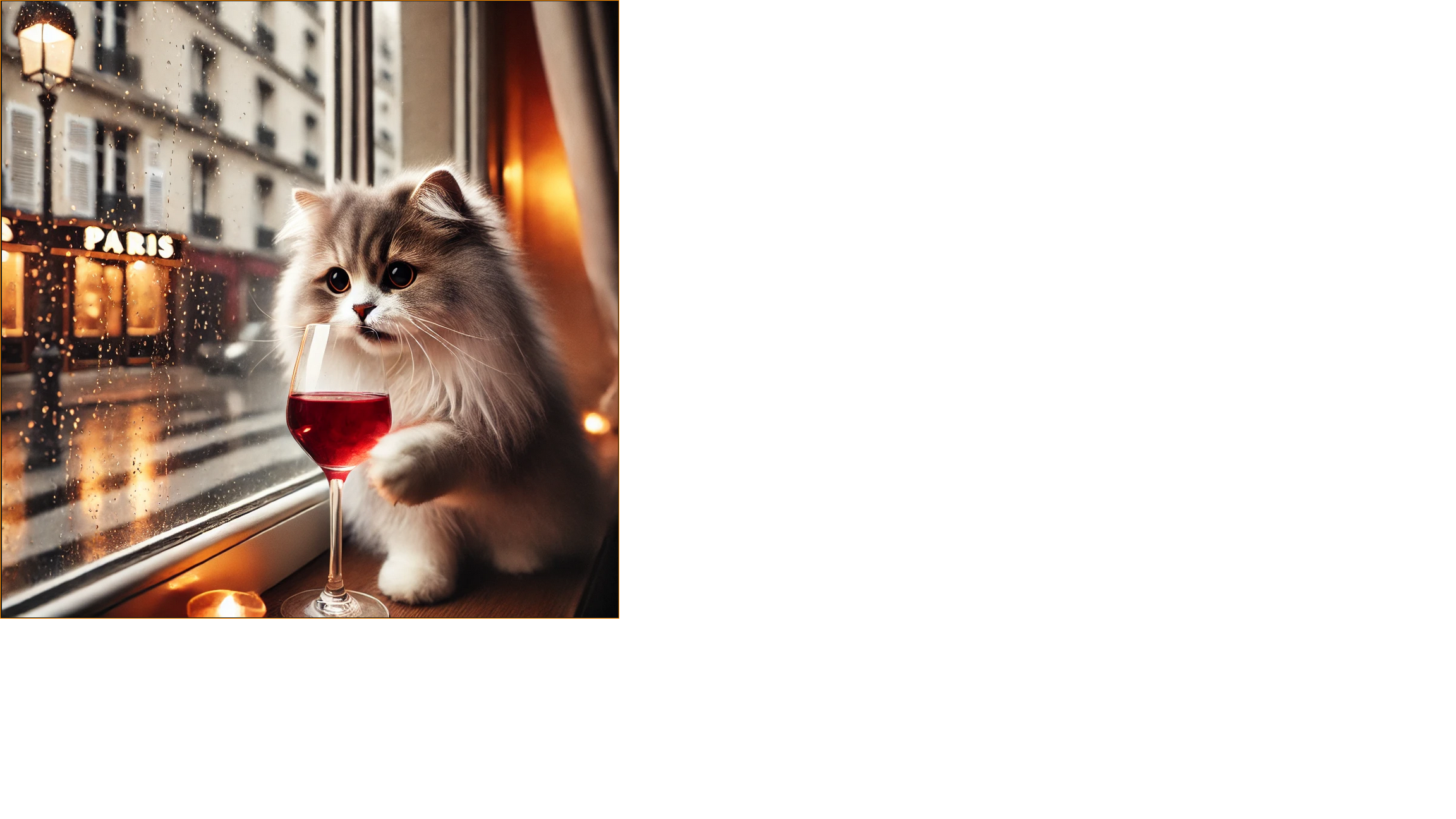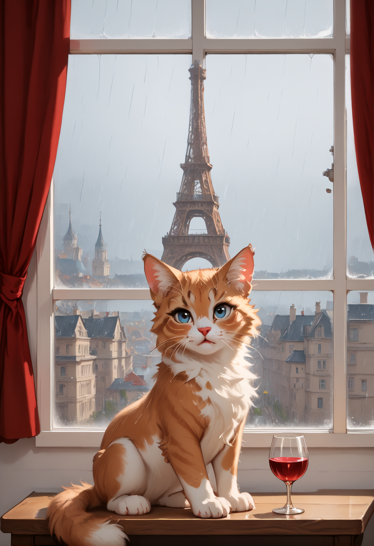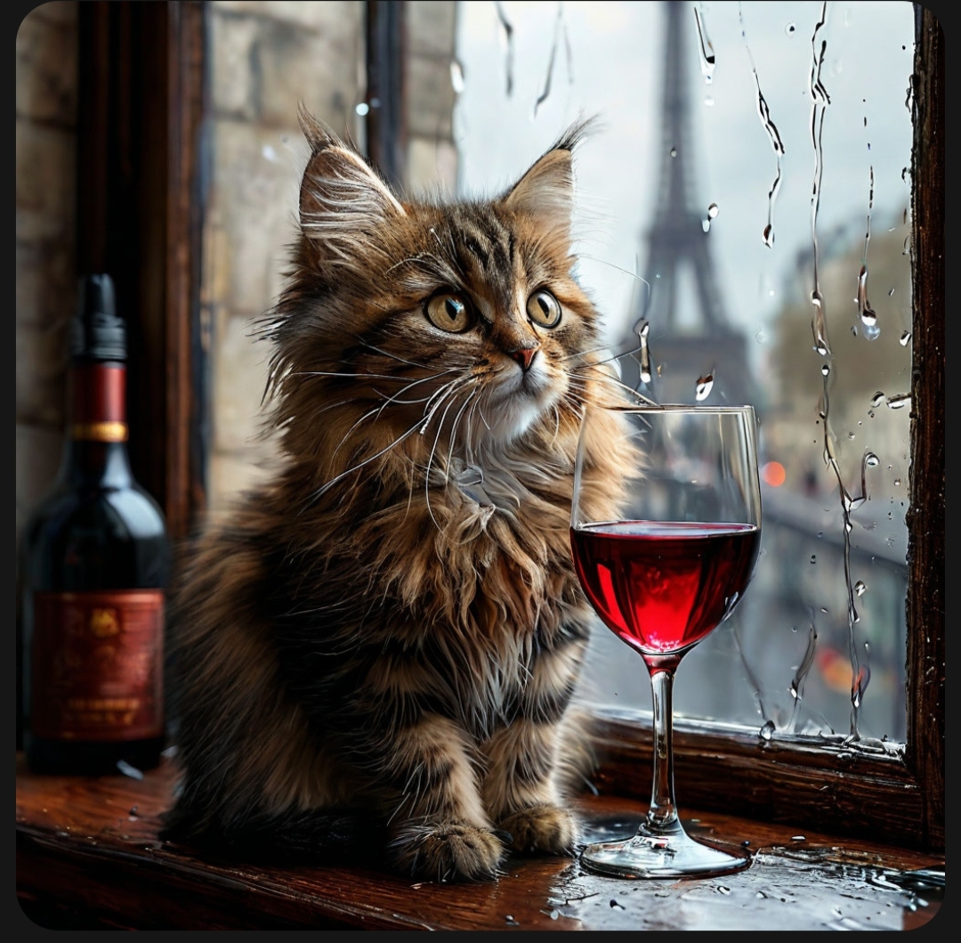 А вот midjourney сделал всё, как сказали. И Париж виден и котик бокал держит.