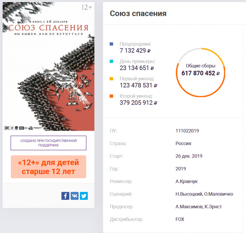 Несмотря на беспрецедентный и очень навязчивый пиар "Союза спасения" на федеральном телевидении и везде где только можно, за две недели проката картина собрала 617 миллионов рублей. Ее создание обошлось в 980 миллионов. Судя по имеющимся данным, фильм вряд ли соберет даже сумму бюджета. Это означает, что примерно две трети потраченных средств не будут возвращены. Но ничего страшного, Мединский и компания, на создание пропагандистской шняги деньги же всегда есть, правильно? Почему бы их в очередной раз в трубу не спустить?
