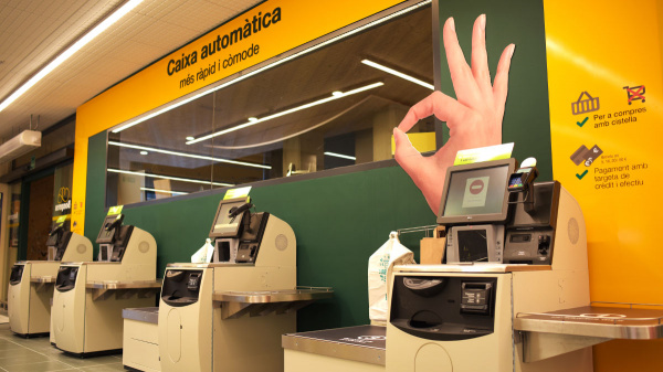 В Alcampo (это местный "Ашан") и кассы самообслуживания уже минимум 10 лет стоят, и также есть система, при которой ты на входе берешь специальное устройство, прямо в зале сканируешь штрих-коды товаров, которые берешь, а потом, возвращая устройство, оплачиваешь то, что набрал.