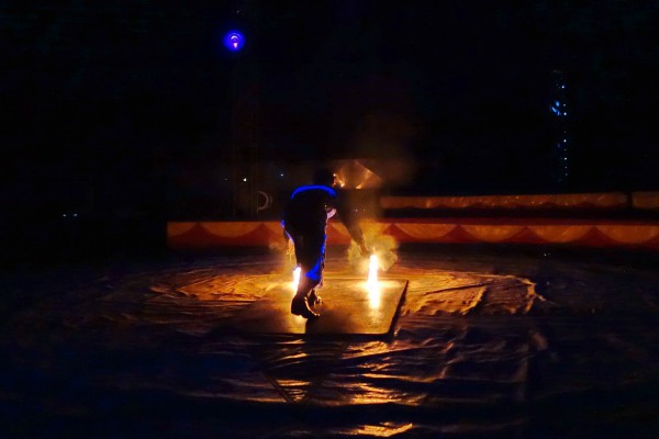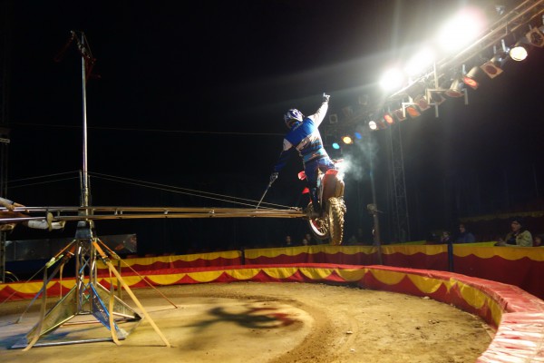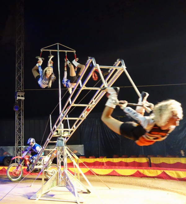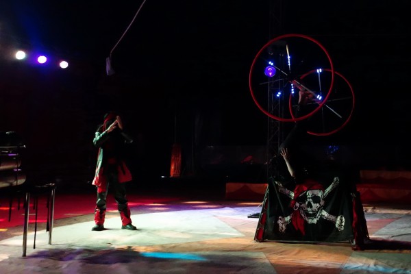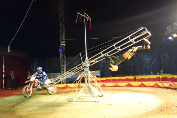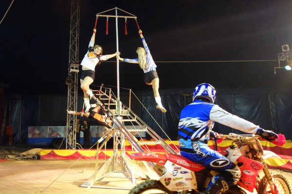 Мотоцикл был прикреплен к специальной стальной конструкции и ездил по кругу. Суть трюка заключалась в том, что на конструкции в различных позах зависали и крутились девушка с каната и с собачками, девушка с шарами, пиратка и парень с шарами. А на мотоцикле сидел кассир, продававший билеты.