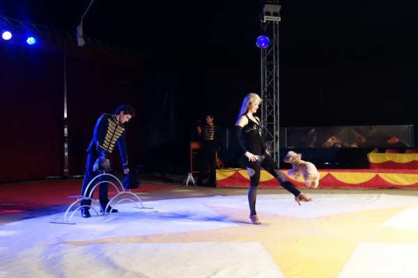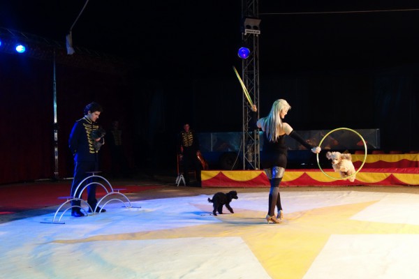 Опять вышла девушка на канате и собачками, после чего стала девушкой с обручами.
