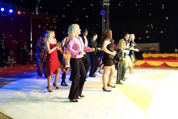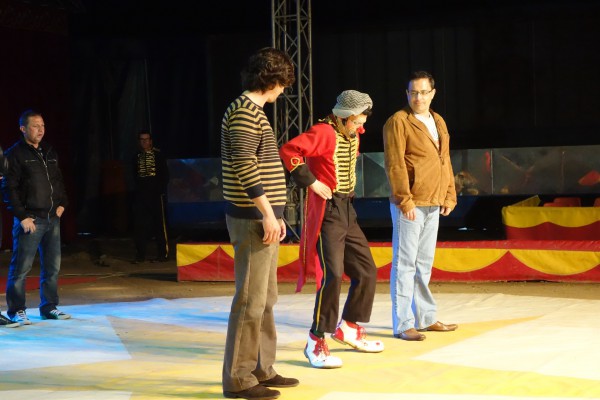 Потом выступающие временно закончились и клоун вывел мужиков из зала - развлекать публику. Я не стал ломаться и вышел - а фигли...