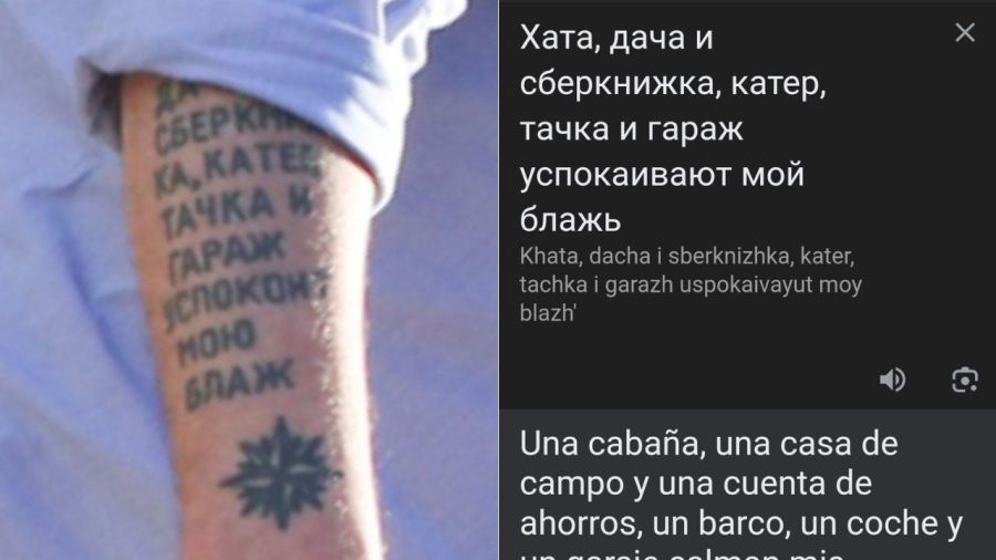 Это татуировка на русском языке, которую перевел один из подписчиков. "Хижина, загородный дом, сберегательный счет, лодка, машина и гараж успокаивают мои прихоти", - гласит татуировка на его руке.