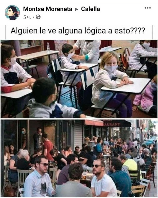 А логика во всем этом безумии, очевидно, есть. Чиновники же тоже бухают по барам, как и все остальные испанцы. А в школе чиновник не учится, он из этого возраста давно вырос. Так что он просто заботится о здоровье детишек - вы разве не видите, что они все в намордниках? О них добрый дядя-чиновник позаботился.
