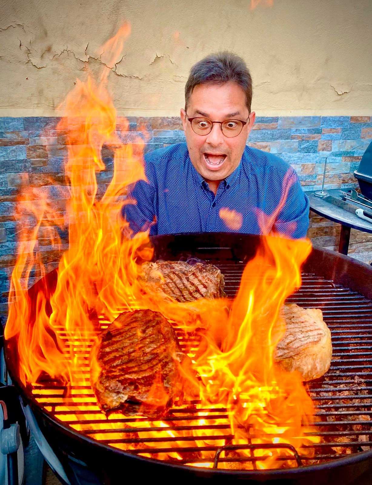 Предвосхищая вопросы: нет, конечно, мы стейки на таком огне не жарим, на таком огне они держатся несколько секунд - для образования корочки, а после этого закрывается крышка гриля и никакого открытого огня там уже нет.