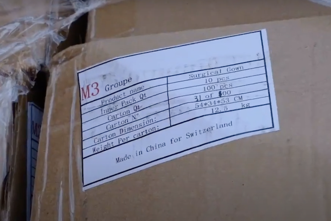 Губернатор Апулии опубликовал и видео, на котором благодарные итальянцы встречают "помощь от патриарха Кирилла". Но ой: на коробках, которые разгружают из грузовика со швейцарскими регистрационными номерами, почему-то написано, что изготовлено в Китае и предназначено исключительно для Швейцарии.