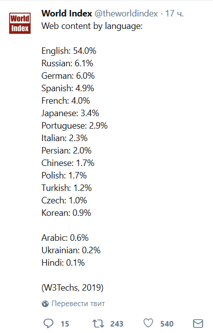 Русский - на втором месте. Люблю, помню, горжусь. Испанский, на котором в мире говорят больше, чем на английском, на четвертом. Прелестно, ёптыть, не так ли? А китайского контента - и вовсе менее двух процентов, сколько их там китайцев-то вообще, действительно.