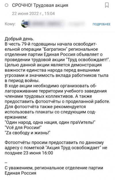 Белорус Влад Бохан отправил в школу в городе Клин электронное письмо с требованием провести акцию «Труд освобождает», сделать фотографии, при этом использовать для фотоотчета плакаты с символами Z и V.