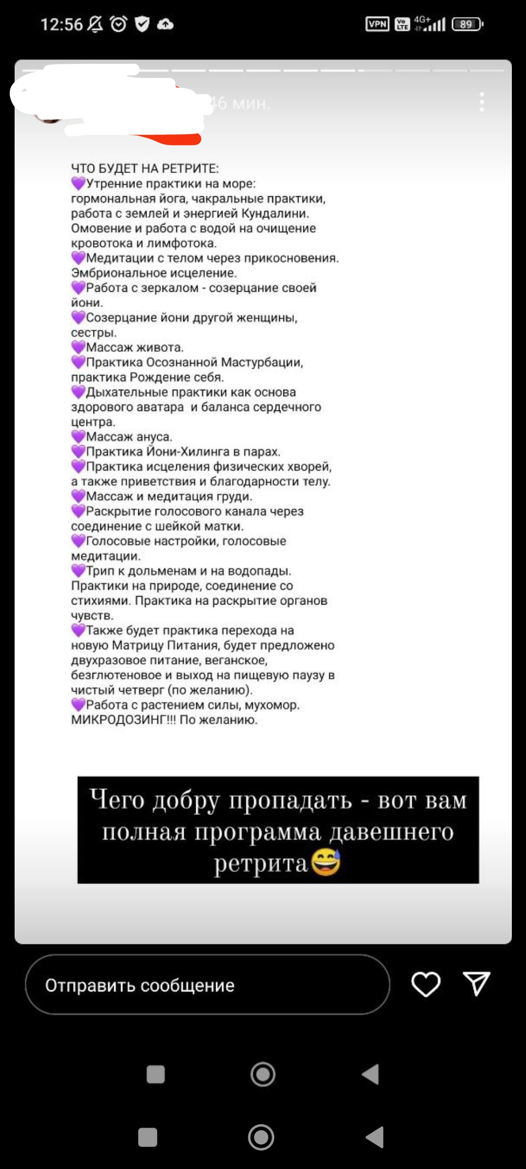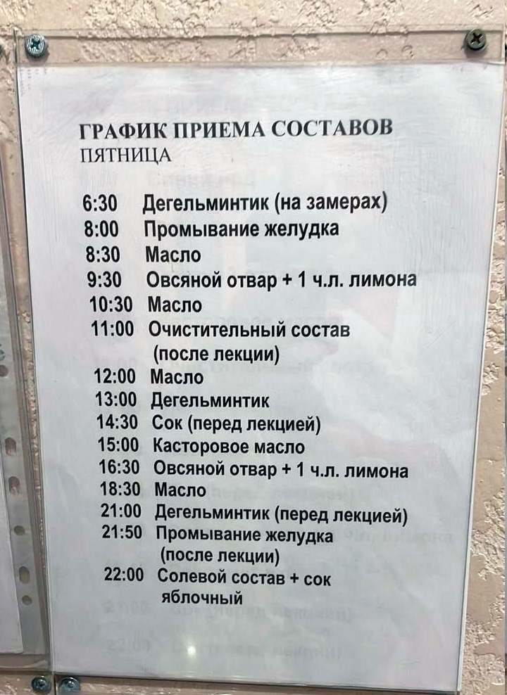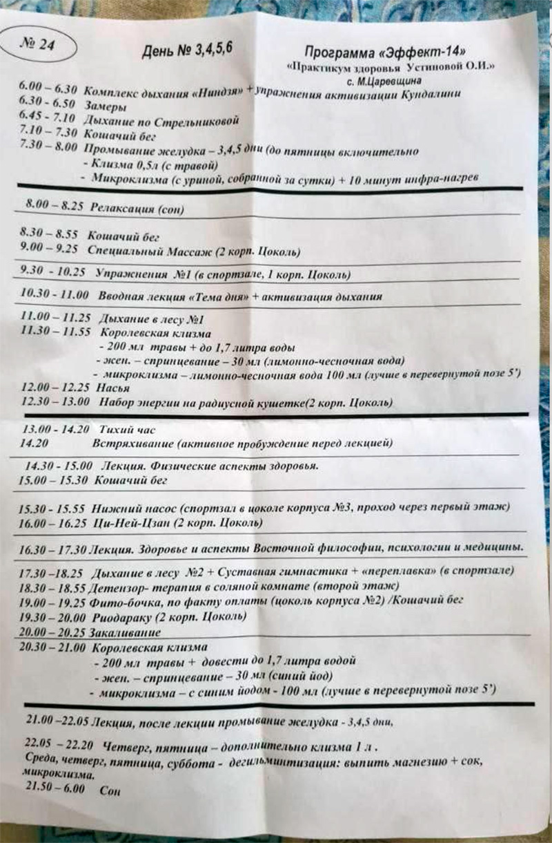 Не хотите ли со страшной силой оздоровиться? Программа реально прекрасная. С утреца кошачий бег (бег трусцой с вдыханием-выдыханием как у кошки), затем клизма и микроклизма с уриной, которую вы сами должны предоставить. Потом кошачий бег, дыханиие в лесу, королевская двухлитровая клизма, а потом микроклизма. Тихий час, лекция, кошачий бег, лекция, дыхание в лесу, фито-бочка, лекция, снова клизма. Потом еще лекция и еще клизма - ну и спать. В какие-то дни - ура, ура - добавляются дополнительные клизмы.