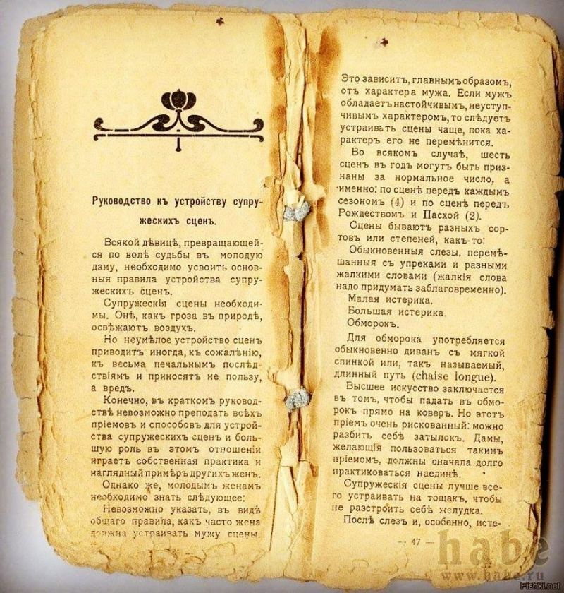 Кстати есть подобный самоучитель и для мужей, называется типа "как правильно бить жену", причём там даже разделения по сословиям - как бить купцу, мещанину, дворянину, есть много тонкостей и нюансов.