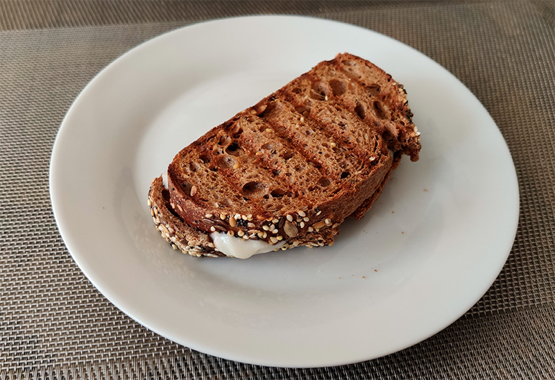 Лучше всего для такого бутерброда взять темный зерновой хлеб, который без добавления сахара - он для здоровья намного полезнее, чем белый хлеб, в тесто которого сахар сыпят ведрами. (У меня жена такой зерновой хлеб покупает большим караваем, нарезанным на кусочки, и замораживает в морозилке: так он хранится сколько угодно, а когда потребуется - достается нужное число кусочков и за полторы минуты разогревается в тостере. Но, конечно же, никто не мешает использовать свежий хлеб. )