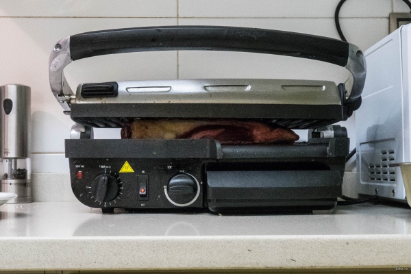Это на тесте гриль от Redmond, пишу обзор. Tefal у меня был на тесте, я сам по-прежнему использую вот этот гриль, который мне подходит лучше всего. Ему уж лет семь - все пашет.