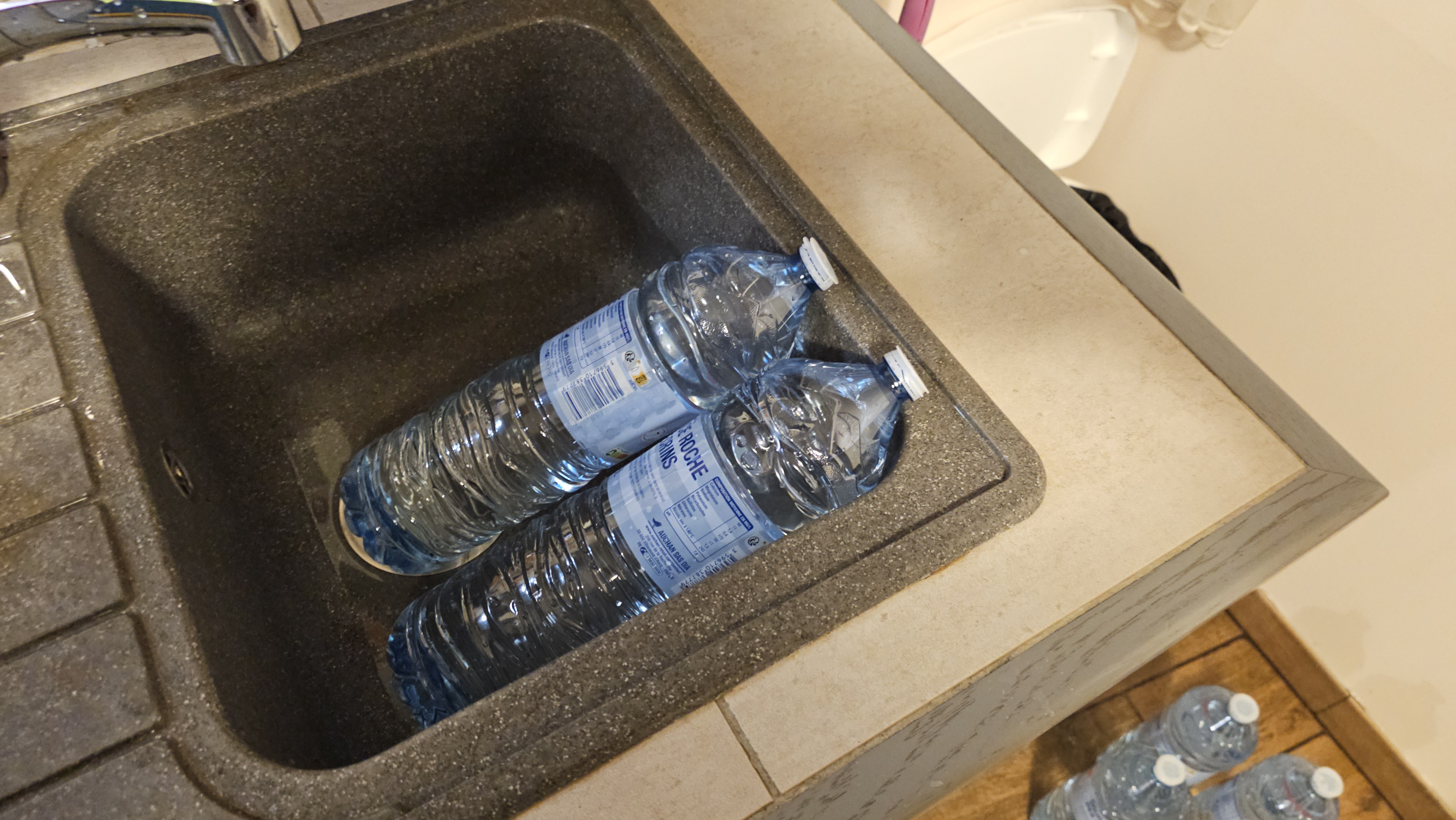 Половину кухни залил, и теперь две бутыли нужно держать вот в таком положении, чтобы вода из разрезов не выливалась.