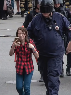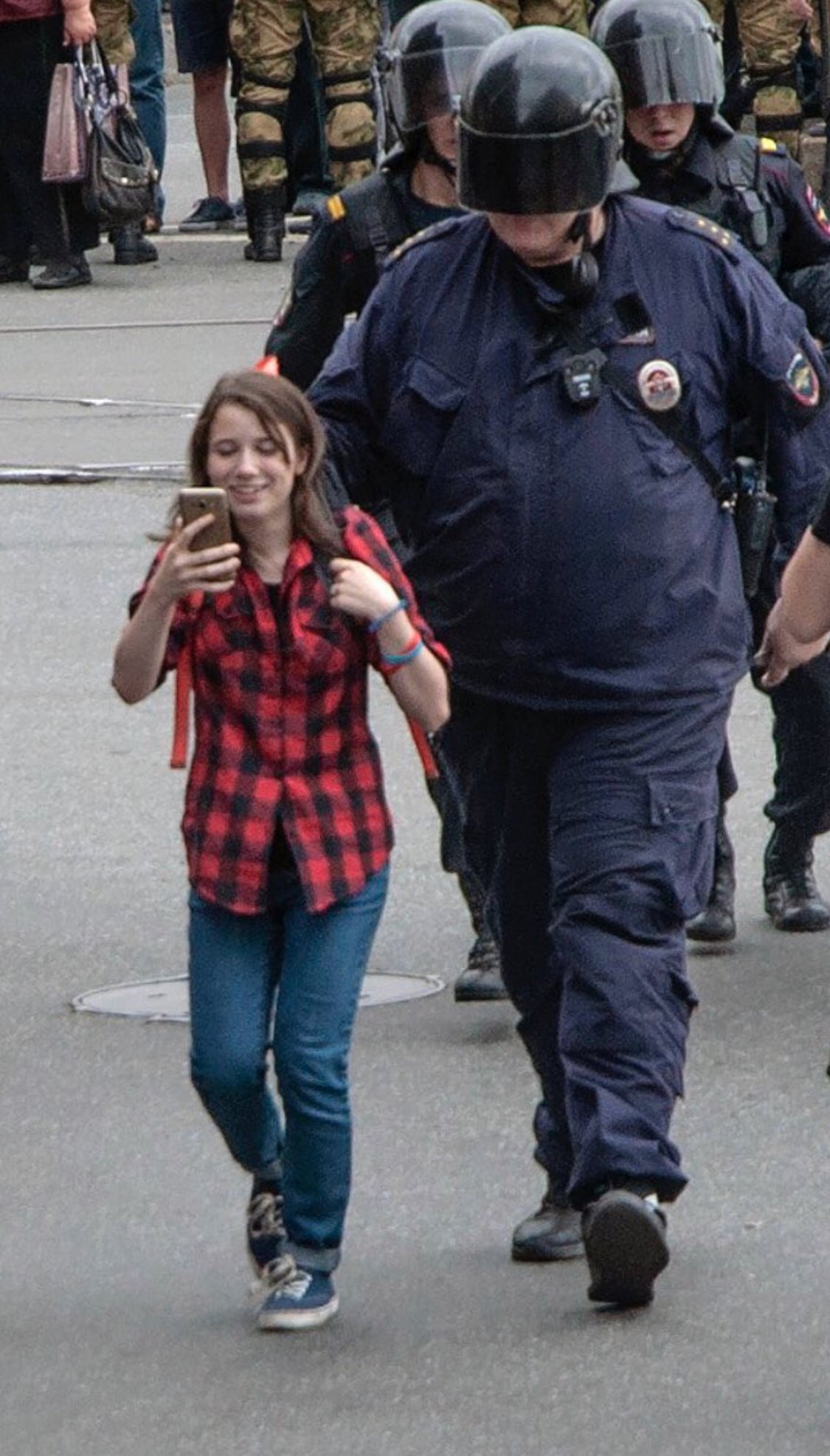 Ну да, развлечение такое - протест. Кстати, фотография ничему не противоречит. Девушку взяли за шкирку, она тут же фотографирует себя и того, кто ее взял и отсылает в сеть - очень разумный ход.