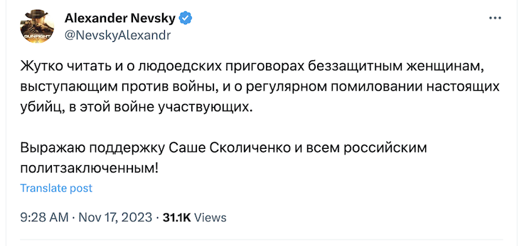 Я не склонный к алармизму человек и меня сложно выбить из колеи. Но что я могу сказать с уверенностью — Саша Скочиленко сейчас в опасности. Ее и без того хрупкое здоровье уже сильно подорвано, а что с ней будет после этапа, не знает никто.