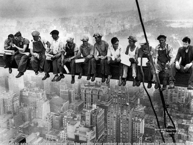 Читал, что это постановочное фото. Для рекламы. Высота, люди настоящие, рабочий процесс не настоящий. Есть еще где лежа отдыхают на этой балке.