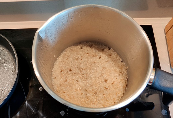 2. заливаю водой, чтобы слой воды сверху киноа был примерно таким как слой киноа. иногда добавляю сразу сухой, густой или кубиковый бульон