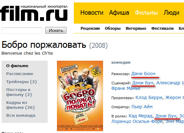 Злобный Фей: Французы с youtube подсказали, что Dany Boon произносится как Дэни Бун, так что кинопоиску тоже двойка