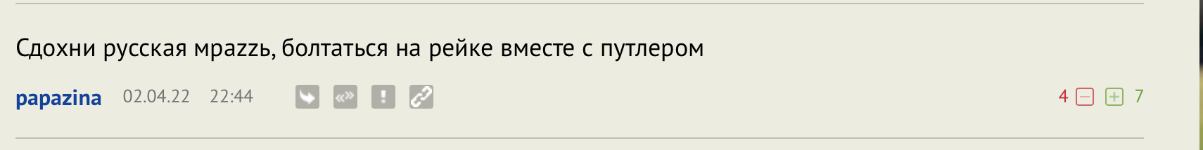 Весь ваш народ, благодаря действиям его сыновей, заслуживает быть вечной парией. Никакая денацификация и дерусификация вам не поможет, очевидно, что нация мародеров и убийц не способна исправиться.