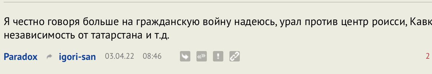 По "национальному вопросу". Да, безусловно, есть более чем вменяемые россияне. Думаю те кто сейчас на территории Украины - с радостью получат укр гражданство и проблем у них в жизни будет куда меньше. Остальным - придется долго доказывать свою вменяемость и непричастность к сотрудничеству с нынешним режимом