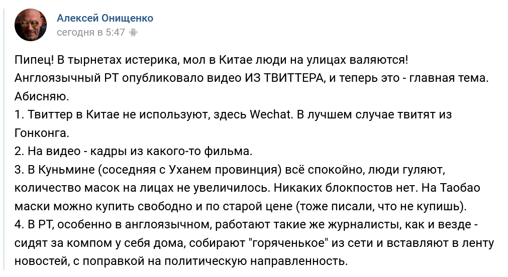 Закрытие 11-миллионного города - это жесткач, конечно. И выглядит достаточно бессмысленным действием. Попробуйте, например, закрыть на карантин Москву. Понятно, что в Китае у Партии и правительства средств сотворить что-то подобное достаточно много, но тем не менее.
